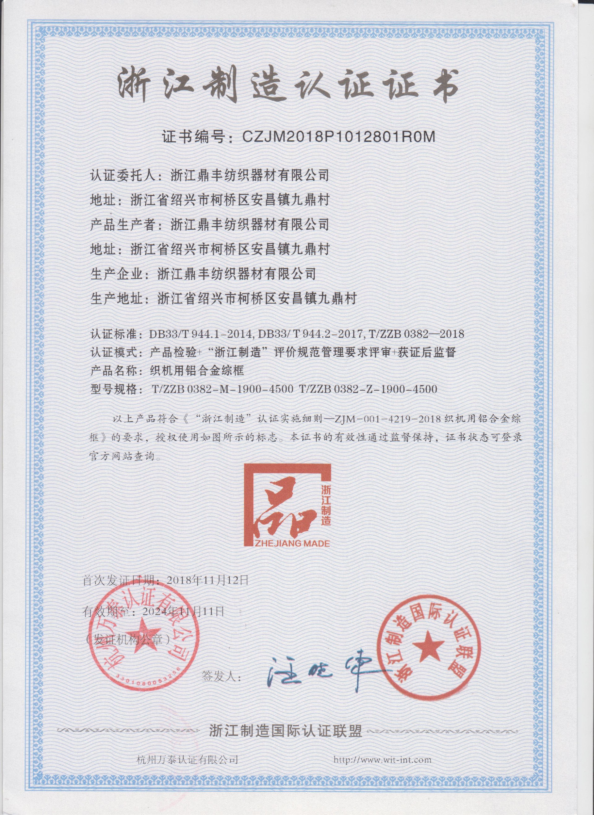 <p>&nbsp;浙江鼎丰纺织器材有限公司始建于1986年，是一家专业生产各类无梭织机用钢筘：喷气筘、喷水筘、剑杆筘、其他类型钢筘；铝合金综框、钢片综、停经片、经轴、织轴、卷布辊等产品及配件的民营企业。</p><p>&nbsp;公司现有固定资产6000余万元，员工300余人，现具有年产喷气异型筘12万米，剑杆筘32万米，喷水筘5万米，综框20万片，钢片综2亿片，停经片1.5亿片, 织轴1.2万套的生产能力。公司“越泉”商标被评为“中国驰名商标”。公司通过ISO9001 :2015国际质量体系认证，ISO14001:2015国际环境管理体系认证，ISO45001:2018国际职业健康安全管理体系认证，喷气织机用钢筘和织机用铝合金综框获得“浙江制造”品牌认证，公司拥有自营进出口权，产品畅销全国并远销印度、巴基斯坦、土耳其、埃及、哥伦比亚、意大利等国家和地区。</p><p>&nbsp;2005年投资新建了浙江鼎丰铝业有限公司，2016年鼎丰企业实现销售收入16亿元。</p><p>&nbsp;公司坐落在绍兴安昌古镇，交通十分便利，距中国轻纺城(柯桥) 8公里，杭州萧山国际机场8公里，配套的产品，一条龙的服务，公司愿与世界各地纺织企业携手合作，共创锦绣前程。</p><p><br/></p>